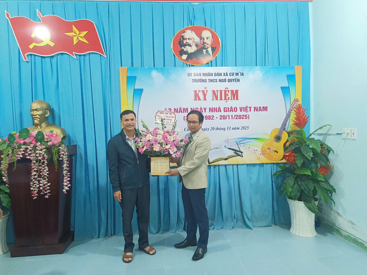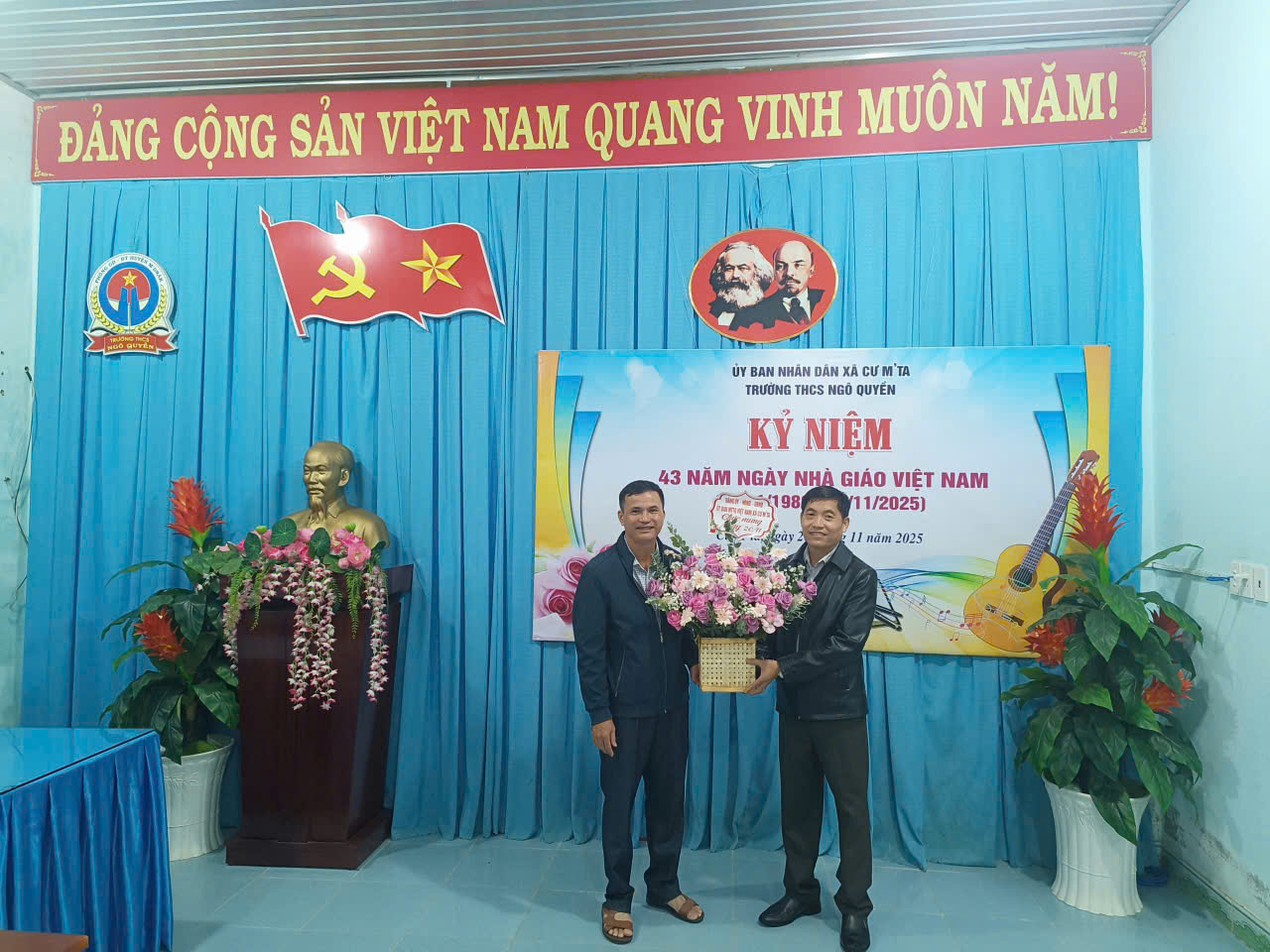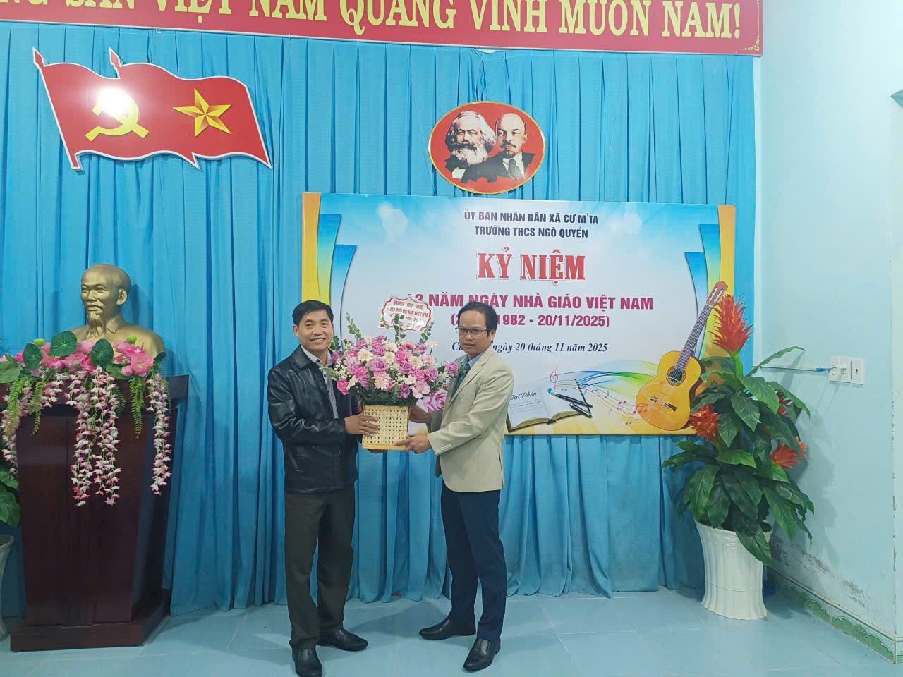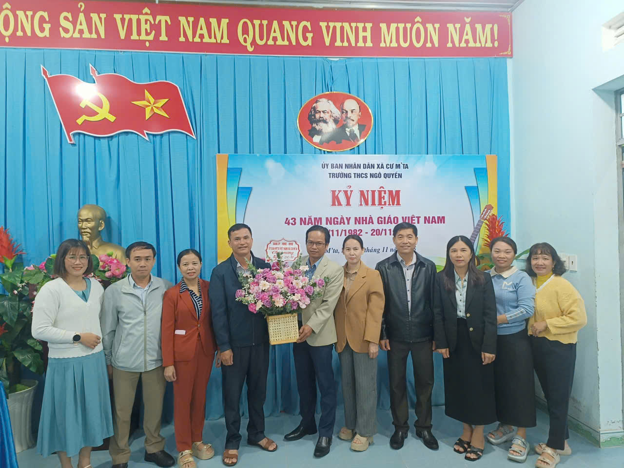 TRƯỜNG THCS NGÔ QUYỀN ĐÓN NHẬN HOA VÀ QUÀ CHÚC MỪNG TỪ UBND XÃ CƯ M’TA NHÂN KỶ NIỆM 43 NĂM NGÀY NHÀ GIÁO VIỆT NAM
